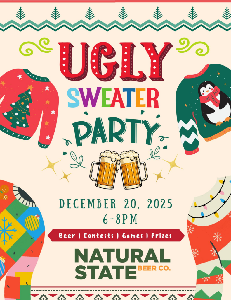 Your most embarrassing holiday sweater has been waiting for this moment. Natural State Beer Co. is turning tacky into a taproom tradition with its annual Ugly Sweater Party.