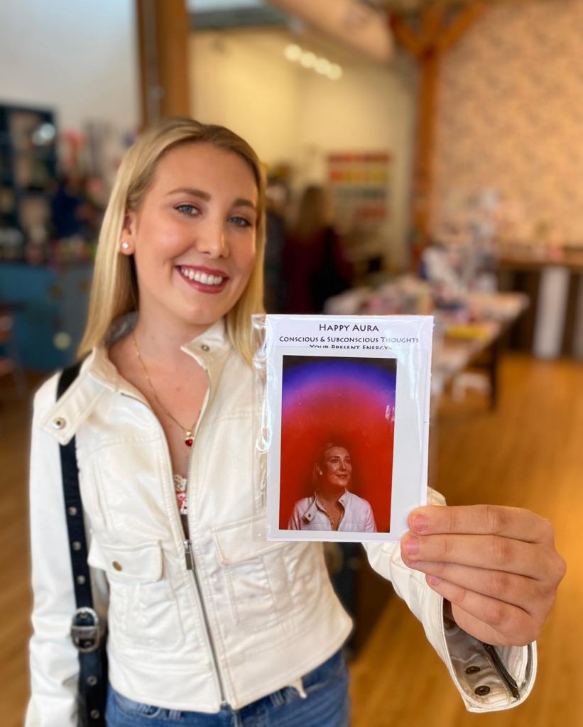Choose between quick energetic check-ins or full interpretations with trained readers. The $50 individual check-in gives you a film copy of your aura and an interpretation card with your colors circled, letting you explore the meanings on your own time. The $75 individual session includes 15 minutes with a reader who walks you through what your colors mean, where they’re positioned in the photo, and what that says about your current state. Shared energy sessions run $60 for check-ins and $95 for full interpretations, putting two people in one photo to capture how your energies blend together.