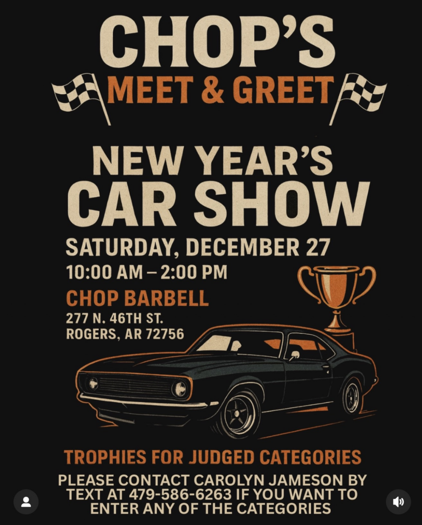 Start your year with chrome, horsepower, and community spirit when Chop Barbell hosts its New Year’s Car Show. The Rogers fitness hub will turn into a celebration of classic cars and local giving, with all proceeds supporting the Special Olympics.