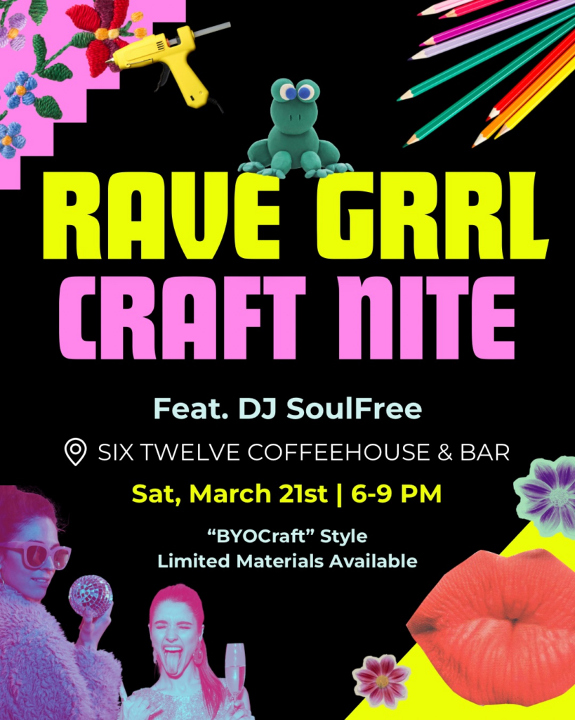 Mark your calendar for March 21 and head to Six Twelve Coffeehouse & Bar for a night of crafts, EDM, and good company. Check the Facebook Event for updates and details.