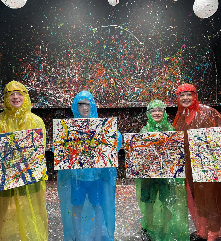 Next, head to the Splatter Room for glow-in-the-dark painting. You’ll each get a 9×12 canvas to create vibrant artwork using splatter techniques. Let loose and see what you come up with.