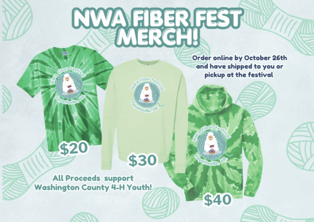 What sets the NWA Fiber Festival apart is its mission-driven foundation. Created in response to growing demand for accessible fiber arts in the region, the festival serves a dual purpose by nurturing the local textile community while investing in the next generation. All proceeds directly support Washington County 4-H youth development programs, funding camps, workshops, scholarships, and opportunities that help young people develop skills, confidence, and leadership abilities. Through 4-H, youth gain hands-on experience that extends far beyond the classroom, learning to become self-directing, productive members of society. Join the festival this November and support the cause. Show your support with official NWA Fiber Festival merchandise! Check out our short-sleeve t-shirts, long-sleeve shirts, and hoodies featuring the festival’s adorable sheep design. All proceeds go straight to the Washington County 4-H Foundation to support our youth development activities.