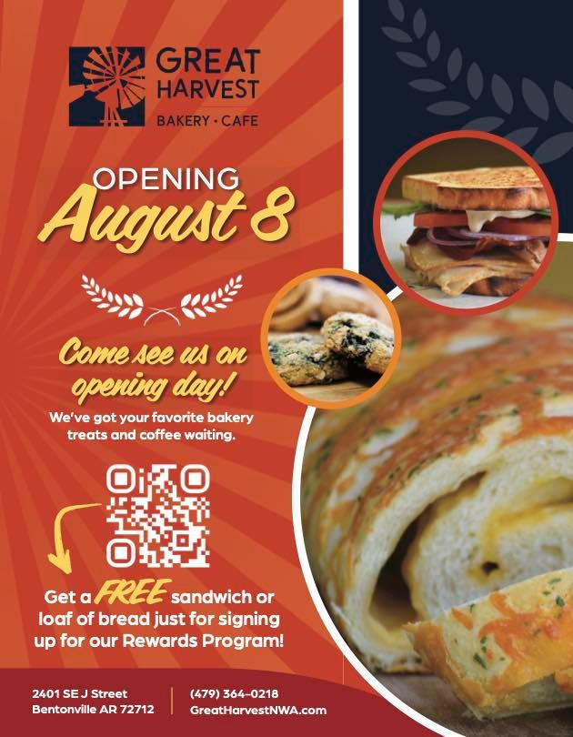 Bentonville just got a whole lot more delicious. The grand opening of Great Harvest Bakery Café is finally here! Fresh-baked bread, made-from-scratch sandwiches, and that perfect cozy café vibe are ready to welcome you. Come by and enjoy bread the way it’s meant to be—warm, delicious, and crafted with care!