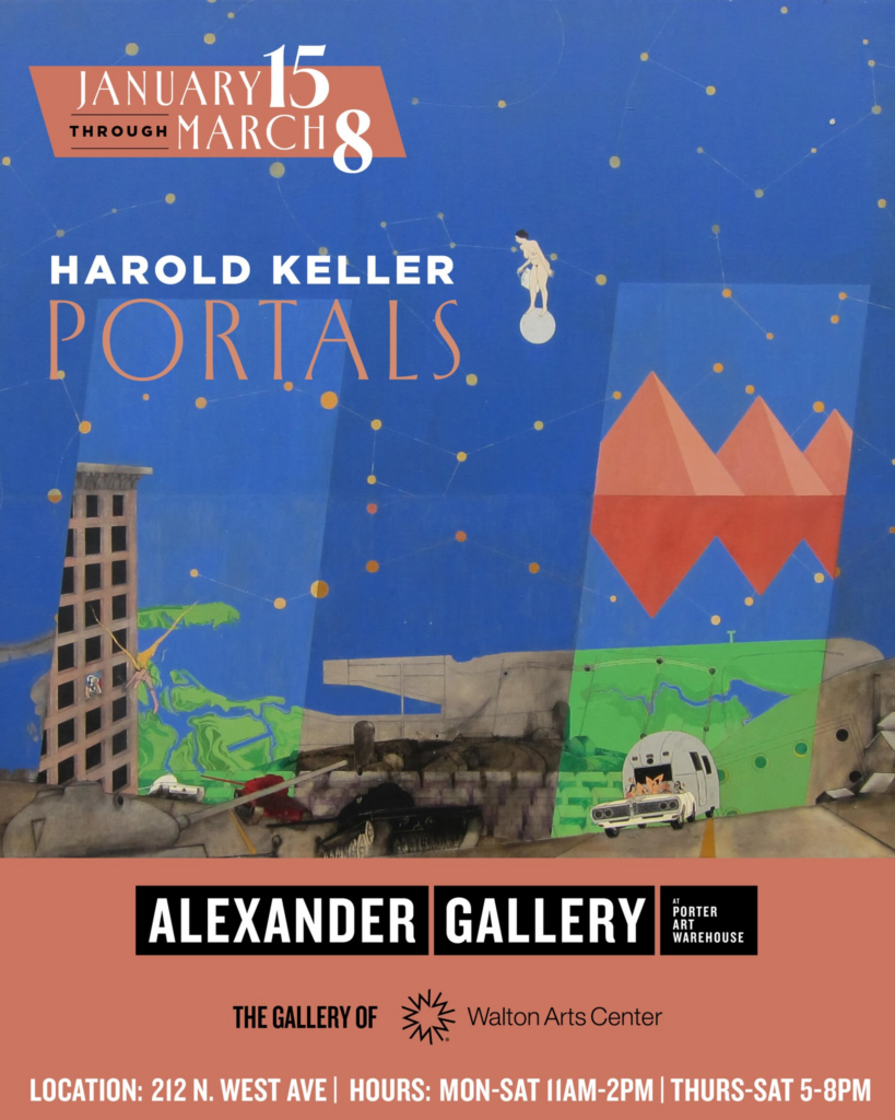 The Porter Art Warehouse at Walton Arts Center has a new tenant. Harold Keller: Portals marks the venue’s first art showcase in Fayetteville’s downtown arts district, featuring magic realism work that blends everyday life with the fantastic.