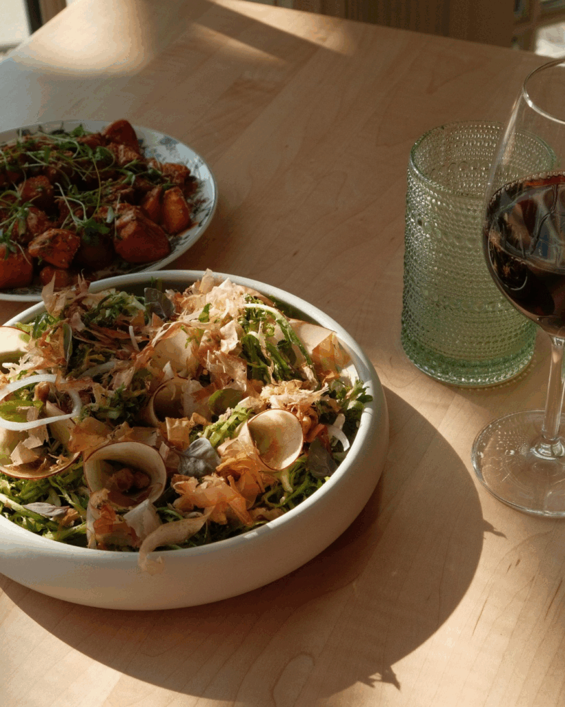 Finish with either apple tatin topped with bourbon oat crumble or rosemary cake with white chocolate pumpkin ganache, sugared walnuts, and pumpkin seeds. Each dish leans into fall flavors while hitting that sweet spot between nostalgia and something new.