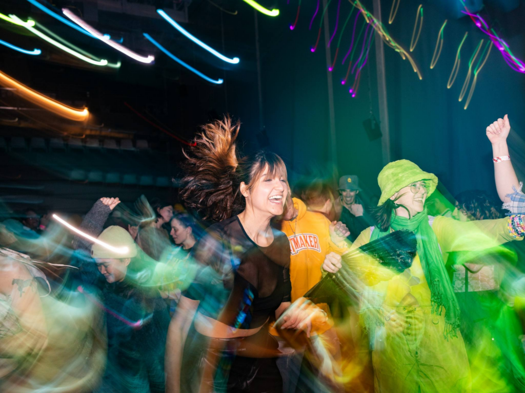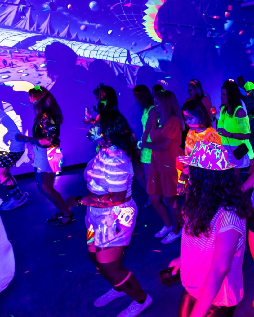 When you arrive, you choose your glow color. Green means you’re single, yellow means it’s complicated, and red means you’re there for the dancing and nothing else. Glow accessories are provided at the door, so the guesswork is already handled before you say a word.