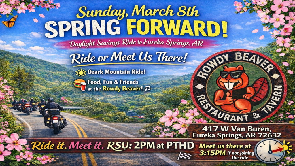 The ride wraps up at Rowdy Beaver on W Van Buren in Eureka Springs, where good company is waiting. Stick around, swap stories from the road, and enjoy the evening. If you’re not riding, head straight there and meet the crew at 3:15 PM.