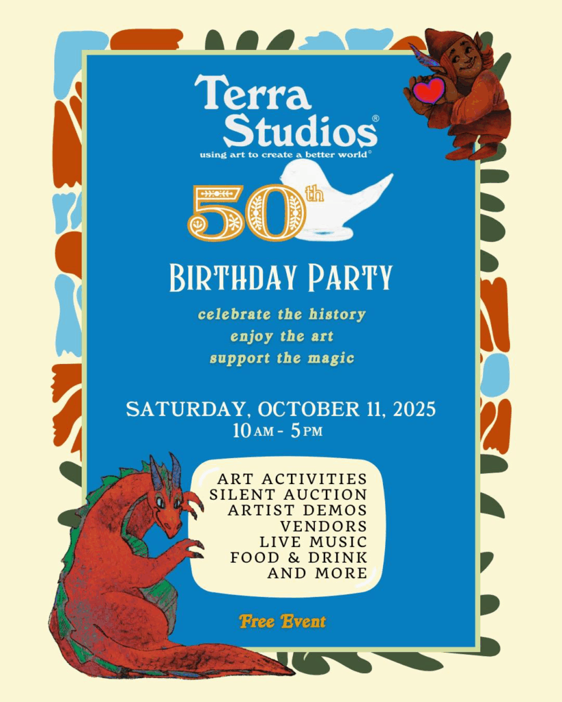 There’s also a silent auction running from 10 a.m. to 4 p.m., with proceeds supporting Terra Studios’ mission to use art as a force for good in the community. For 50 years, Terra Studios has believed that creativity can change the world. Come celebrate that vision, explore the beautiful grounds, and be part of a community that’s been nurturing art and imagination for half a century. See you there.