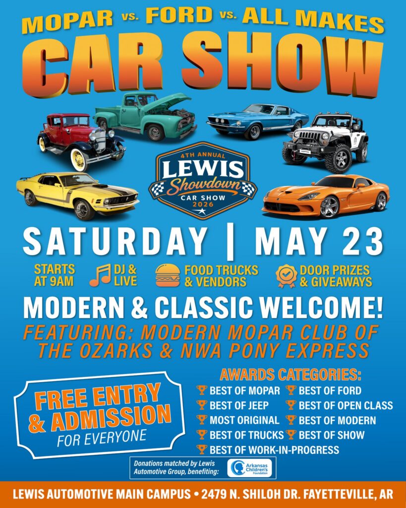 The Lewis Showdown draws car enthusiasts from across NWA and beyond, with Modern Mopar Club of the Ozarks and NWA Pony Express both rolling in this year. Nine award categories span Best of Ford, Best of Mopar, Best of Jeep, Best of Show, Most Original, Best of Modern, Best of Trucks, Best of Open Class, and Best of Work-in-Progress.