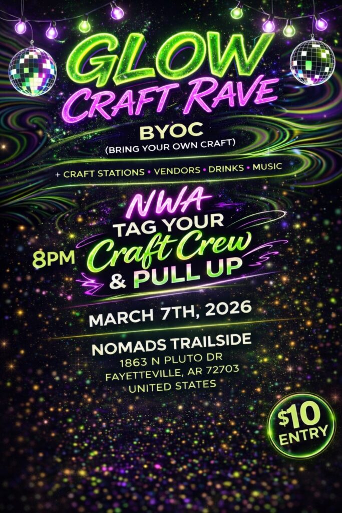 Nomads Trailside is one of Fayetteville’s go-to spots for events that feel a little outside the box, and the Glow Craft Rave fits right in. Tag your craft crew, your “I’ll try anything once” friend, or that person who’s been looking for a reason to get out of the house. At $10 a head, there’s no reason not to pull up with the whole group. See you there!