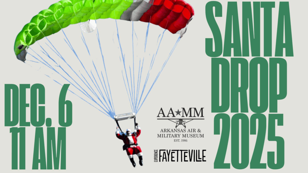 This is the annual Santa Drop that NWA families wait for all year, and it’s happening at the Arkansas Air & Military Museum in Fayetteville. Have your cameras ready to capture Santa’s freefall from the sky, then grab your spot in line for photos inside a C-130 Hercules. Think your kids would love this? Here’s everything you need to know.